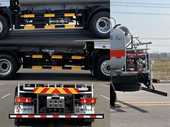其它 装备有罐体和喷洒系统,用于园林绿化喷洒作业.介质:水,罐体总容量:10立方米,罐体有效容积为9.5立方米,罐体尺寸(长×长轴×短轴)(mm):4100×2400×1450;仅采用3950mm轴距;选装装饰管,选装前鸭嘴,选装箭头灯,选装不加装雾炮;侧后防护装置材料均为:Q235B,侧后防护装置与车架连接方式均为螺栓连接,后防护装置截面尺寸为:120×68mm,后防护装置离地高度480mm,ABS型号为J ABS,生产厂家为焦作博瑞克控制技术有限好色网.