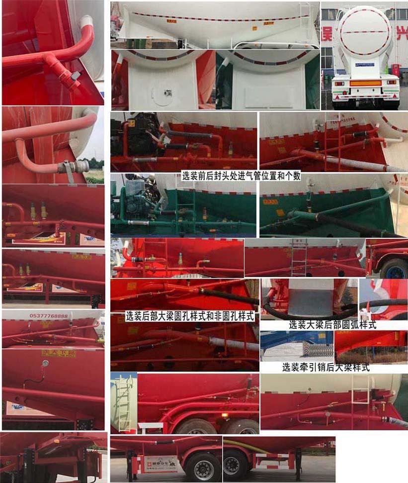 罐体总容量:29.2立方米,罐体有效容积:27.8立方米,运输介质:固井专用水泥,介质密度:1200千克/立方米;罐体外形尺寸罐体长(含封头)8540mm,最大截面处宽2550mm,最大截面处高3040mm,最小封头直径为2010mm(选装最小封头直径为1910mm),选装罐体长(含封头)为8050mm,最大截面处宽2550mm,最大截面处高3040mm,最小封头直径为2010mm(选装最小封头直径为1910mm);选装前部不加装机组时整车长度(mm)为:8720,8300,选装走台样式,选装后组合灯样式,选装后组合灯所在部件样式,选装尾部标志板安装位置,选装号牌板安装位置,选装前位灯前回复反射器安装位置及所在部件样式,选装前位灯样式,选装爬梯安装位置(前部/侧面/后部)和个数(一个/两个/三个),选装前后封头处进气管位置和个数,选装大梁圆孔样式和非圆孔样式,选装大梁后部圆弧样式,选装牵引销后大梁样式,选装空气悬架,选装后部大梁堵板样式,选装下出灰管道样式,选装管道样式,选装机组样式,选装外观样式;ABS系统生产厂家:广州瑞立科密汽车电子股份有限好色网,梁山顺安达汽车科技有限好色网,广州市西合汽车电子装备有限好色网,山东梁山德尔福汽车科技有限好色网,型号:CM2XL-4S/2M,SAD-ABS4S/2M,XH-GQ4S2M-E01,DEF-ABS4S/3M;侧面及后下部防护装置所用材料材质为:铝合金,侧面及后下部防护装置与车辆连接方式均为:螺栓连接,后部防护装置的主要尺寸参数:断面尺寸(mm)为120×68,离地高度为:500mm,选装侧面及后下部防护装置所用材料材质为:Q235,与车架连接方式均为焊接或螺栓连接; 顶部封闭不可开槽,后部不可开启;车长/牵引销到车辆最前端距离/轴距/后悬对应关系为:9500/1230/4800+1310+1310/850,9500/1470/4560+1310+1310/850,9500/1470/4370+1310+1310/1040,8720/450/4800+1310+1310/850,8720/960/4370+1310+1310/770,8300/540/4370+1310+1310/770,8720/690/4560+1310+1310/850,8720/770/4560+1310+1310/770,8720/530/4800+1310+1310/770. |