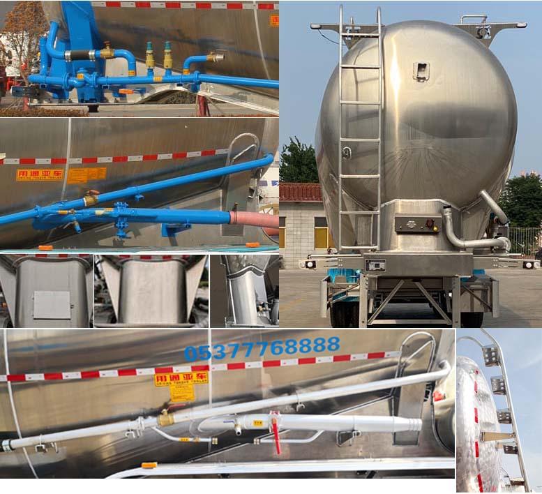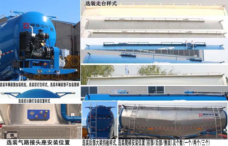 该车为铝合金材质;顶部封闭不可开槽,后部不可开启;罐体总容量:30.2立方米,罐体有效容积:28.7立方米,罐体尺寸长(含封头)8550mm,最大截面处宽2550mm,最大截面处高3010mm,前后封头直径为2050mm,选装前后头直径为2010mm,选装罐体尺寸长(含封头)8750mm,最大截面处宽2550mm,最大截面处高2980mm,前后封头直径为2050mm,选装前后头直径为2010mm;选装车辆前部加装机组,加带机组时外形尺寸长(mm)为9900,9800,不加带机组时外形尺寸长(mm)为9150,8980;当轮胎型号为11R22.5 14PR时,轮胎中间加装雨帘;ABS系统生产厂家:广州瑞立科密汽车电子股份有限好色网,广州市西合汽车电子装备有限好色网,山东梁山德尔福汽车科技有限好色网,型号:CM2XL-4S/2M,XH-GQ4S2M-E01,DEF-ABS4S/3M;侧面及后下部防护装置所用材料均为:铝合金,连接方式均为螺栓连接,后部防护装置的断面尺寸为120×68mm,离地高度为500mm,选装走台样式,选装前位灯样式,选装爬梯安装位置(前部/后部/侧面)及个数(一个/两个/三个),选装前示廓灯安装部件样式,选装气路接头座安装位置,选装后部大梁挡板样式,选装尾部标志安装位置,选装后组合灯样式为矩形样式,选装罐道样式,选装管道样式;车长/牵引销到车辆最前端距离/轴距/后悬对应关系为:9900/1220/5230+1310+1310/830,9900/1300/5180+1310+1310/800,9800/1300/5080+1310+1310/800,9800/1350/5000+1310+1310/830,9150/550/5180+1310+1310/800,9150/500/5230+1310+1310/800,8980/450/5080+1310+1310/830,8980/530/5000+1310+1310/830,8980/480/5080+1310+1310/800,8980/560/5000+1310+1310/800. |