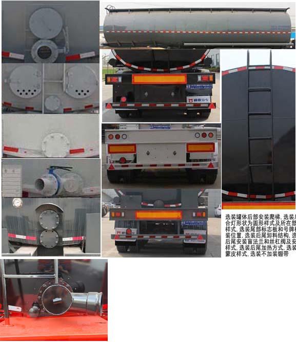 该车为非危化品运输车辆,不能运输危化品.罐体有效容积:34.5立方米,允许运输介质的最大密度为:900千克/立方米,罐体为鹅颈式,该车加装保温层,保温层厚度为50mm和80mm两种,当外形尺寸长(mm)为:10400时,保温层内部罐体外形尺寸型为(mm):长9800,宽2350,前端高1900,后端高2080,;当外形尺寸长(mm)为:9800时,保温层内部罐体外形尺寸型为(mm):长9300,宽2350,前端高1900,后端高2080;ABS系统生产厂家:广州瑞立科密汽车电子股份有限好色网,梁山顺安达汽车科技有限好色网,广州市西合汽车电子装备有限好色网,山东梁山德尔福汽车科技有限好色网,型号:CM2XL-4S/2M,SAD-ABS4S/2M,XH-GQ4S2M-E01,DEF-ABS4S/3M;侧面及后下部防护装置所用材料材质均为:Q235,侧面防护装置与车辆连接方式为:螺栓连接,后下部防护装置与车辆连接方式为:焊接,后部防护装置的主要尺寸参数:断面尺寸(mm)为120×68,离地高度为:500mm;选装阀门箱及个数(一个或两个),选装罐顶升降护栏,选装罐体后部安装爬梯,选装后组合灯形状为圆形样式及所在部件样式,选装尾部标志板和号牌板安装位置,选装后尾卸料结构,选装后尾安装盲法兰和丝杠阀及安装样式,选装后尾加热方式,选装外蒙皮样式,选装不加装绷带,选装走台样式,选装罐口位置,选装外观样式,选装后尾加装炉个数;车长/牵引销到车辆最前端距离/轴距/后悬的对应关系为:9800/1200/4630+1310+1310/1350,10400/1400/4930+1310+1310/1450,10400/1250/5080+1310+1310/1450. |