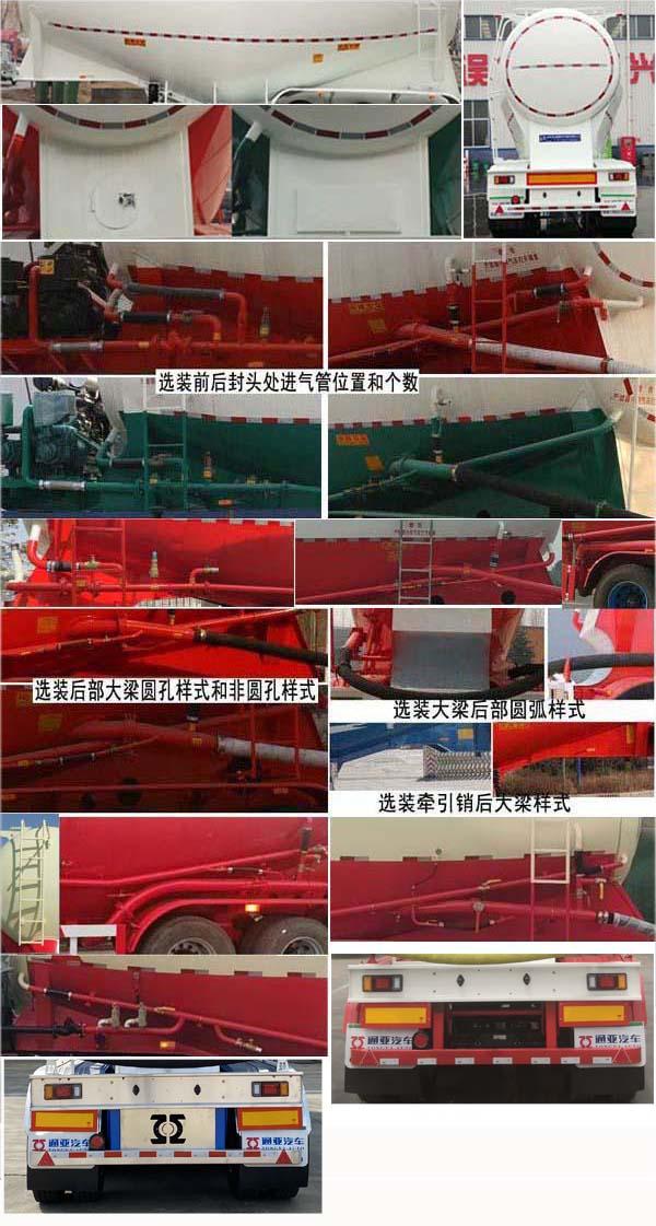 顶部封闭不可开槽,后部不可开启;罐体总容量:56立方米,罐体有效容积:53.6立方米;罐体外形尺寸罐体长(含封头)11550mm,最大截面处宽2550mm,最大截面处高3360mm,前后封头直径为2010mm(选装前后封头直径为2062mm或2112mm),选装罐体长(含封头)为10950mm,最大截面处宽2550mm,最大截面处高3360mm,前后封头直径为2010mm(选装前后封头直径为2062mm);当轮胎型号为11R22.5 14PR时,轮胎中间加装雨帘;选装前部不加装机组时整车长度(mm)为:11600,10980,选装双助吹样式,选装支腿连接件样式,选装外接气源样式,选装压力表安装位置,选装走台样式,选装后组合灯样式,选装前位灯样式,选装爬梯安装位置及个数(一个/两个/三个),选装前后封头处进气管位置和个数,选装大梁圆孔样式和非圆孔样式,选装大梁后部圆弧样式,选装牵引销后大梁样式,选装下出料样式,选装爬梯安装位置(前部/侧面/后部),选装后尾小工具箱样式,选装侧面管道样式,选装机组样式,选装部件位置因为制造误差可有小变化,选装尾部标志板安装位置,选装号牌板安装位置;ABS系统生产厂家:广州瑞立科密汽车电子股份有限好色网,梁山顺安达汽车科技有限好色网,广州市西合汽车电子装备有限好色网,型号:CM2XL-4S/2M,SAD-ABS4S/2M,XH-GQ4S2M-E01;侧面及后下部防护装置所用材料材质为:Q235,侧面及后下部防护装置与车辆连接方式均为:螺栓连接或焊接,后部防护装置的主要尺寸参数:断面尺寸(mm)为120×68,离地高度为:500mm; |