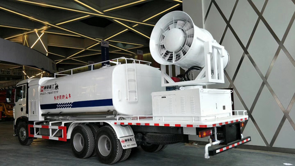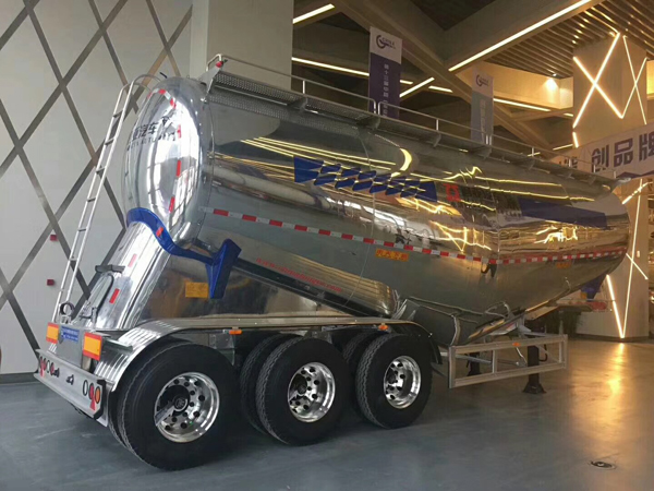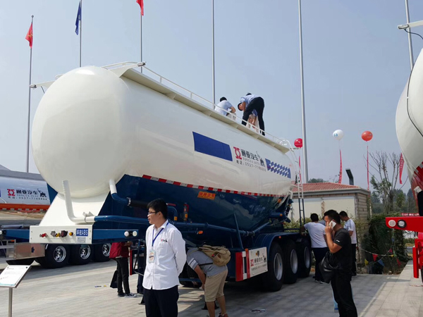 室内展馆作为精品区好色网 展出铝合金粉粒物料半挂车、多功能抑尘车、臂架泵车等7个车型。